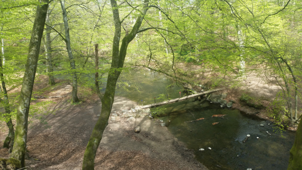 Et vy ud over Køge Å i Lellinge Skoven med nyudsprungne bøgetræer.