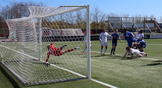 Martin Koch Helsted kommer lige nøjagtigtig en my for sent til et indlæg fra Oliver Sonne i anden halvleg.